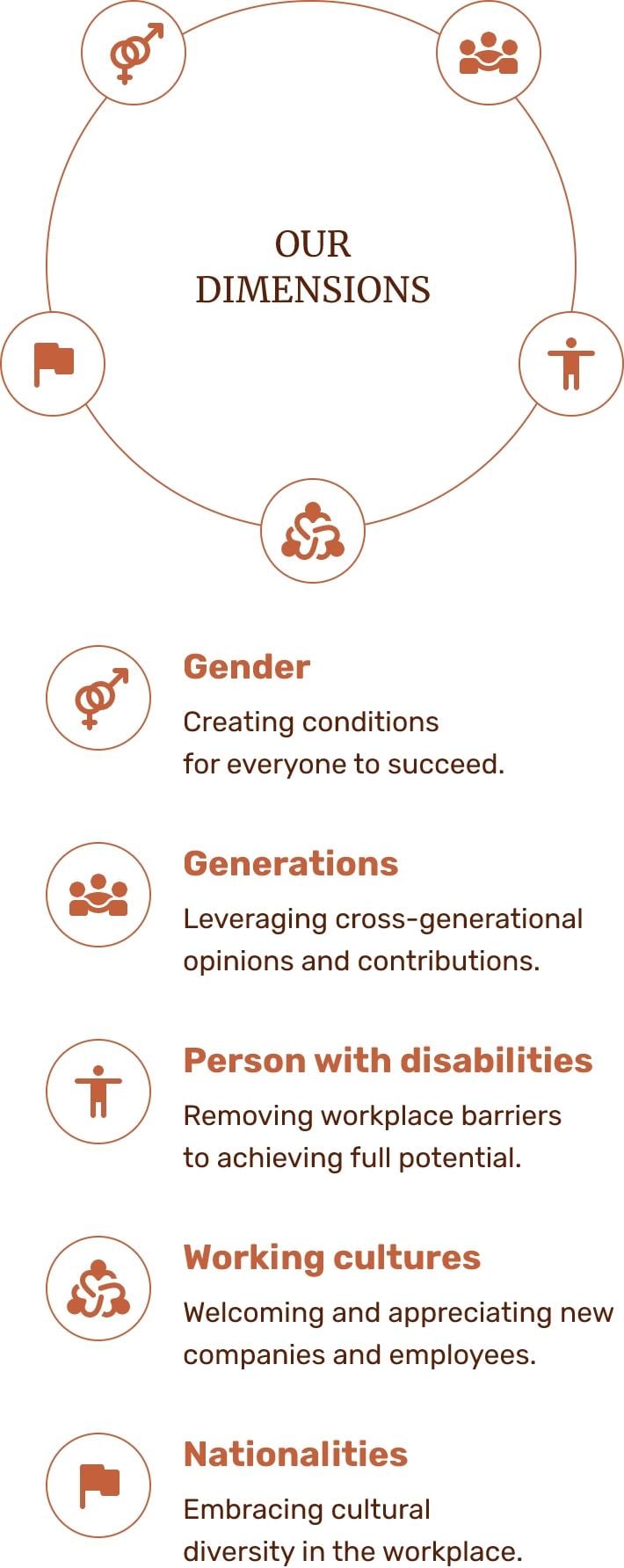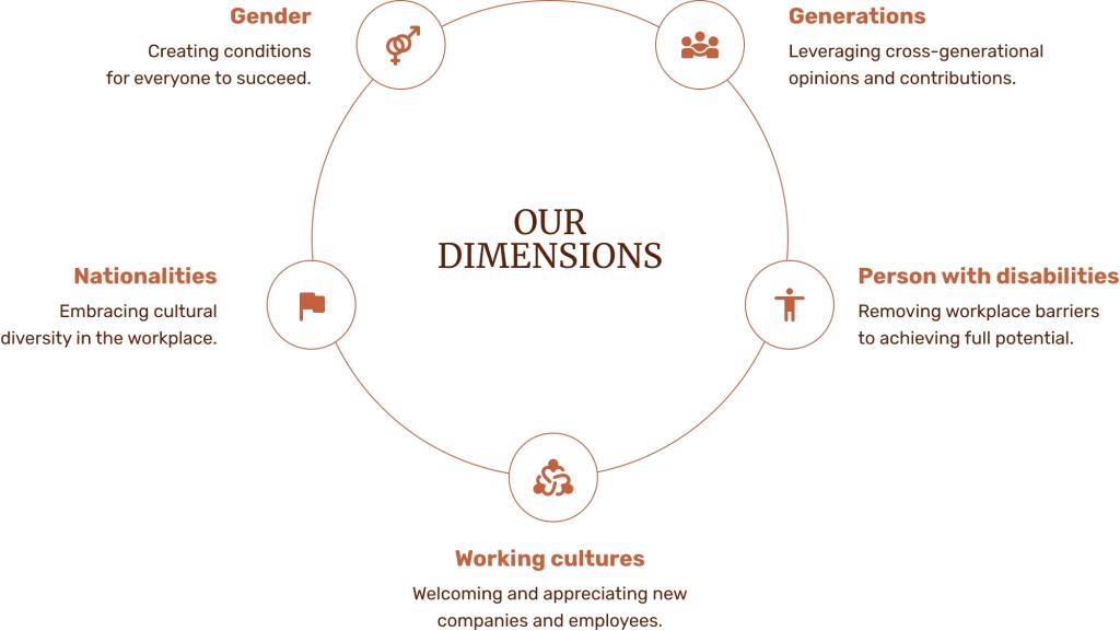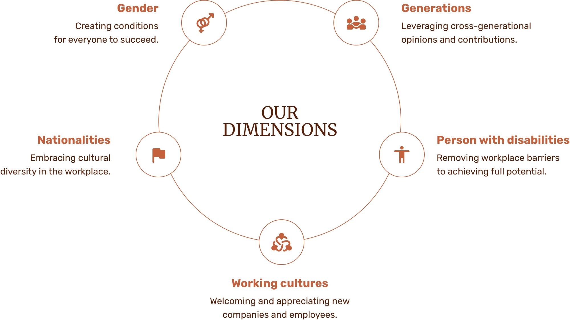 Chez Ferrero, notre stratégie en matière de Diversité, Equité et Inclusion (DE&I) repose sur cinq dimensions qui orientent la définition de nos priorités à l'échelle globale et de nos aspirations pour 2030 : genre, nationalité, générations, cultures du travail et handicap.