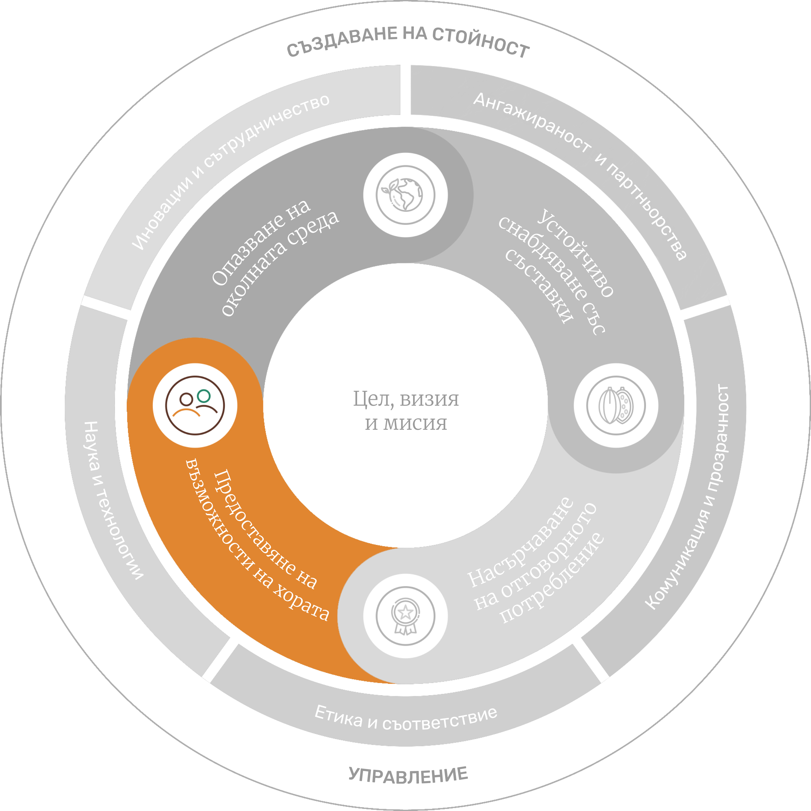Нашият напредък се корени в нашата рамка за устойчивост, която се фокусира върху четири основни стълба на устойчивостта: опазване на околната среда, устойчиво снабдяване със съставки, насърчаване на отговорното потребление и създаване на възможности за хората. Можем да постигнем напредък по тези стълбове, като инвестираме в иновации и технологии, повишаваме прозрачността и спазването на изискванията, както и насърчаваме културата на сътрудничество.