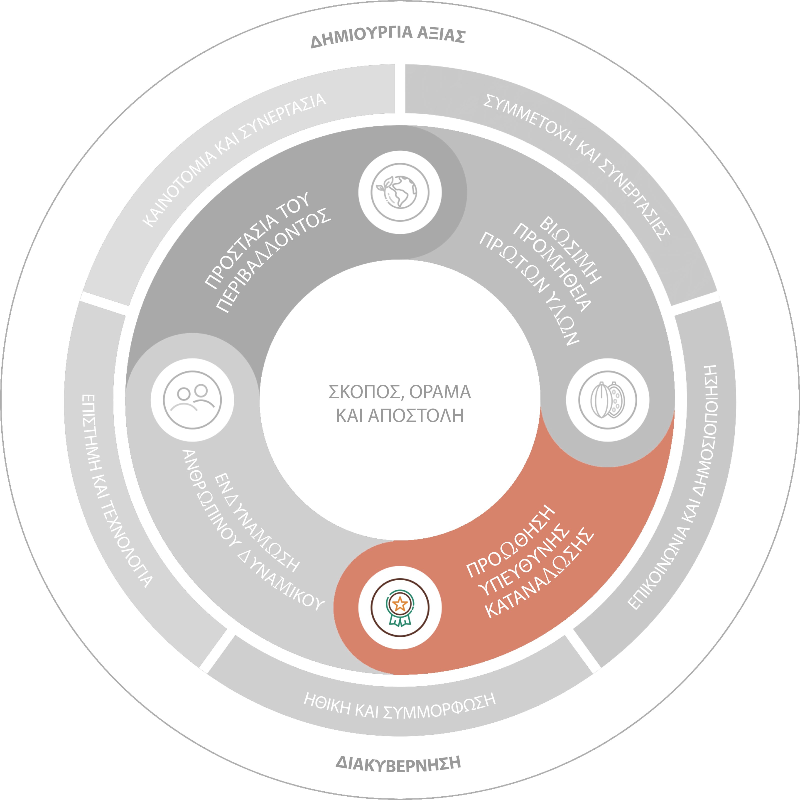 Η πρόοδός μας στηρίζεται σε ένα πλαίσιο βιωσιμότητας που εστιάζει σε τέσσερις βασικούς πυλώνες: την προστασία του περιβάλλοντος, τη βιώσιμη προμήθεια πρώτων υλών, την προώθηση υπεύθυνης κατανάλωσης και την ενδυνάμωση των ανθρώπων. Επενδύοντας στην καινοτομία και την τεχνολογία, ενισχύοντας τη διαφάνεια και τη συμμόρφωση, καθώς και προάγοντας μια κουλτούρα συνεργασίας, προωθούμε την πρόοδο σε κάθε έναν από αυτούς τους πυλώνες.