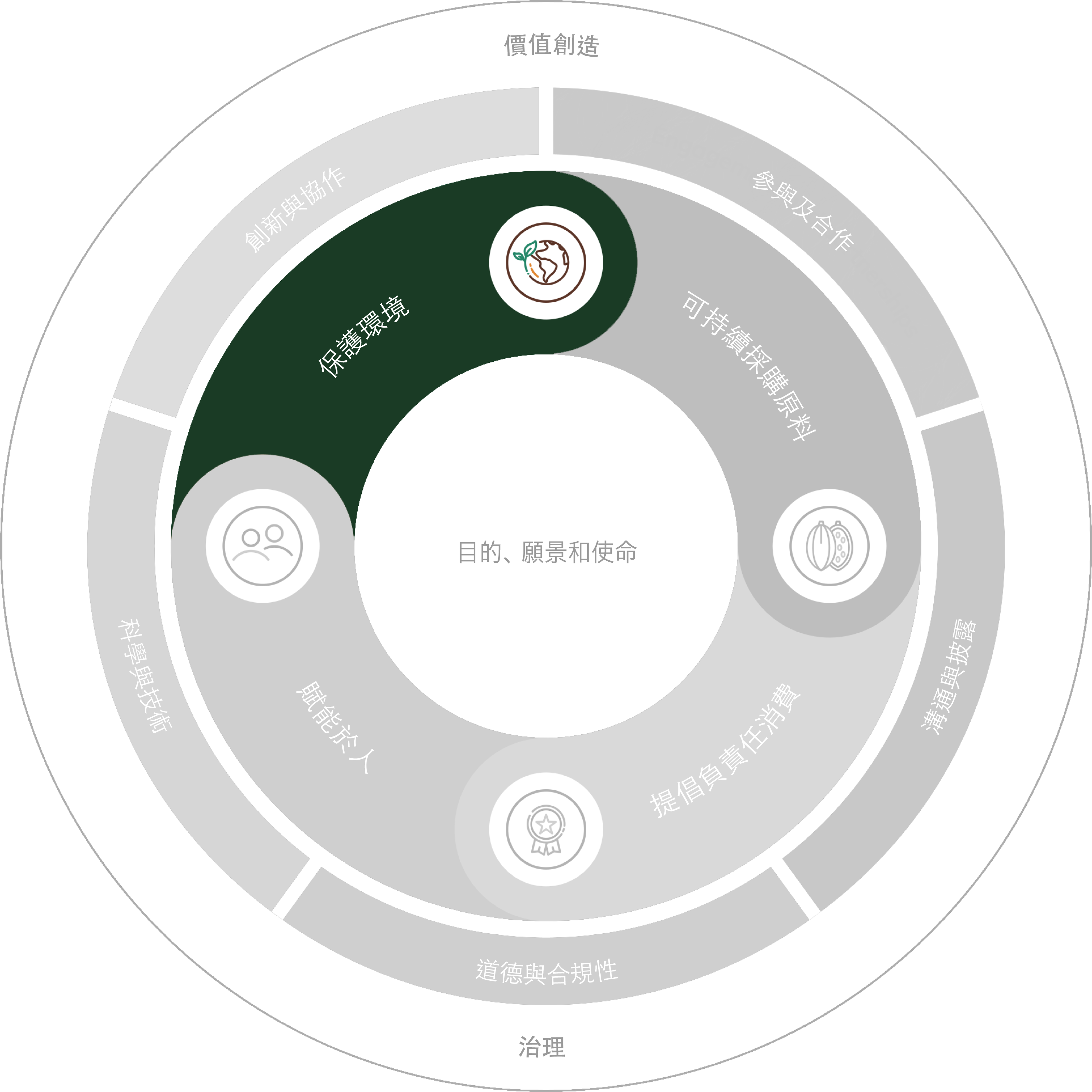 我們的可持續發展策略基於四大核心展開:環境保護、可持續採購原料、倡議負責任消費和賦能團隊及消費者。透過持續投入創新與科技、提升透明度與合規性,以及培養協作文化,我們能在這些領域持續取得突破與成長。