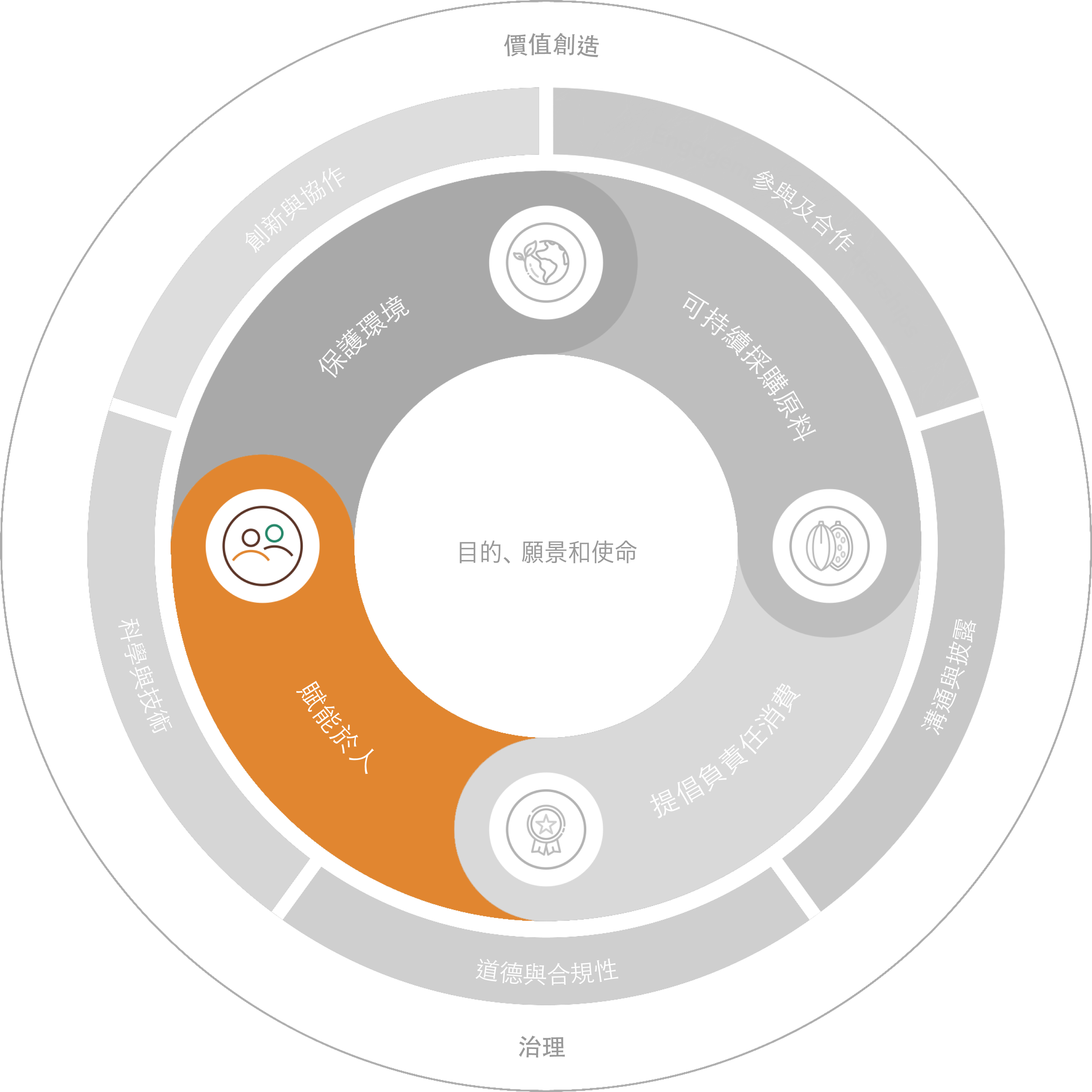 - 我們對人的關注貫穿整個價值鏈,確保在集團運營及全球供應鏈中,始終維持高標準的安全、人權及勞工權益。我們採用以盡職調查為基礎的方法,確保員工、供應商和合作夥伴均遵守Ferrero道德準則、商業行為準則、供應商準則及人權政策聲明中所訂立的標準。