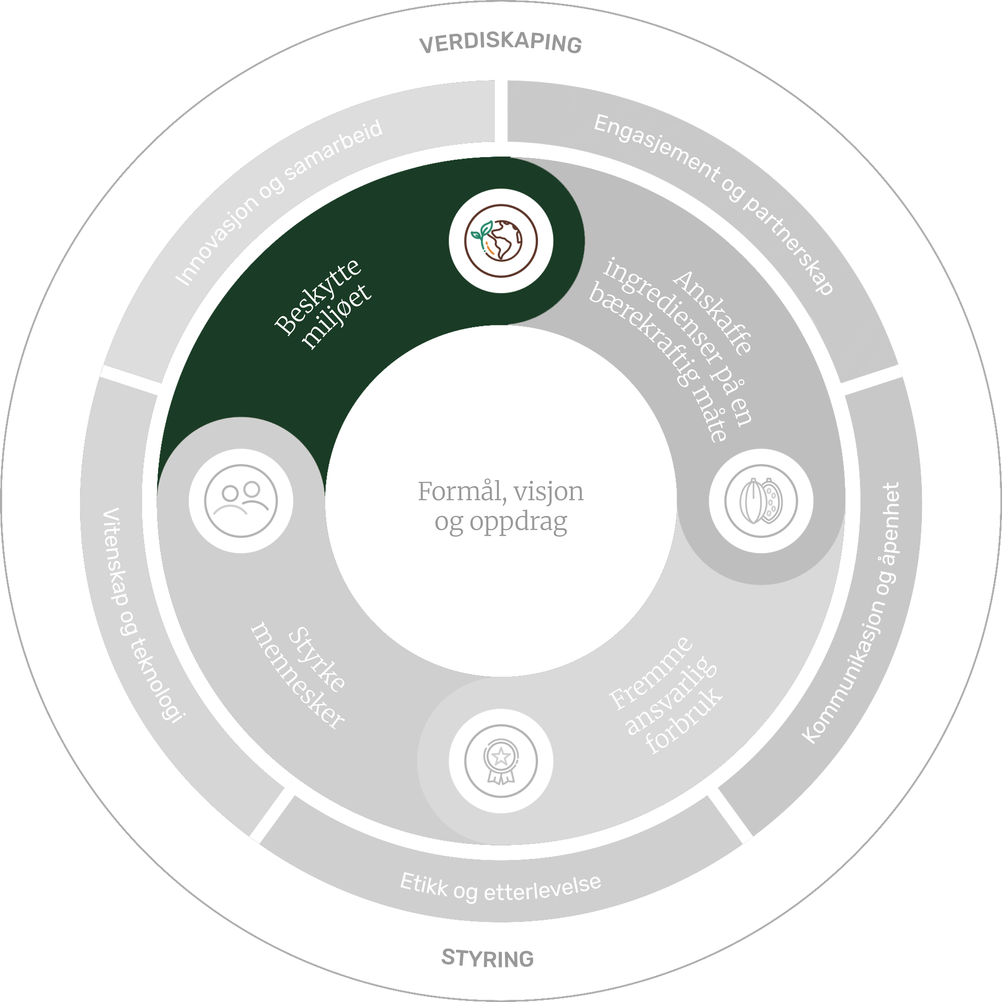 Når vi fortsetter å utvikle virksomheten vår på en ansvarlig måte, sørger vi for at bærekraft er fullt integrert ved å vurdere vår påvirkning og våre muligheter gjennom hele verdikjeden – fra råvarer til slutten av livssyklusen.